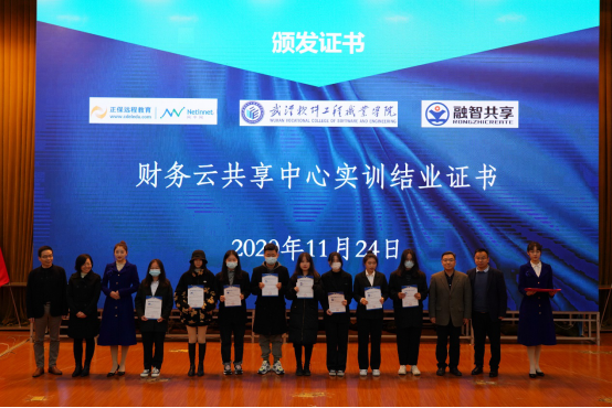 武汉市代理记账协会会长(江都财税董事长)徐新胜、正保网中网院校事业部华中区总经理杨凤坤和商学院副院长郭黎教授、会计教研室主任文茜老师共同为2020年秋季参加财务云共享中心实践教学的学生代表颁发结业证书。