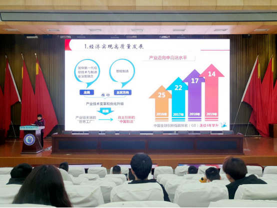 杨京湘副校长通过讲述全面建成小康社会取得的历史性成就,让学生看到国家欣欣向荣,民族自信满怀,人民幸福安康,中华民族伟大复兴的壮丽征程迎来万丈曙光;让大家深刻认识到,全面建成小康社会见证我们党的初心使命、执政能力和领导水平。