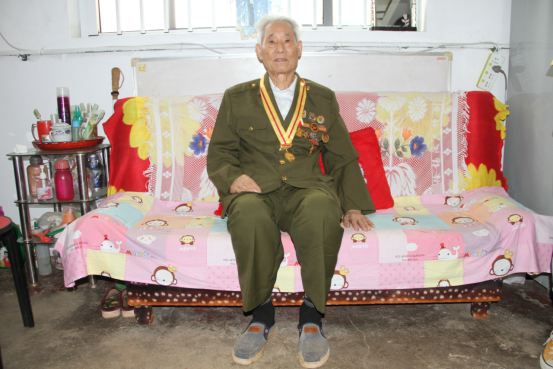 陈老有一件深绿色的旧军装,是他最心爱的宝贝。衣服上别满了勋章,他一一指给我们看:“这是抗美援朝的三级勋章,是朝鲜颁发的;这是淮海战役的;这是渡江战役的;这是解放西南胜利纪念;这是1950年华北解放纪念……”这些莫大的荣誉,都是用命换来的。陈老先后在解放军太行山军区老二团、四十四师、十五军、130团等部队担任班长、副排长、排长、副连长、区队长、政治指导员、协理员等职务,参加过的战争有抗日战争、解放战争、抗美援朝战争等,在进军两广战役中还荣立一等功。