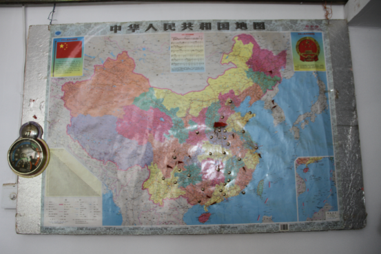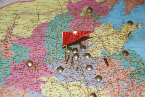 走进陈老的家中,映入眼帘的首先是一张中国地图,上面用钉子作为标记,插满了小红旗,他参军以来走过的所有地方,战斗过的所有地方,全都标记得清清楚楚。其中有一面最大的旗帜,地点是河南焦作。