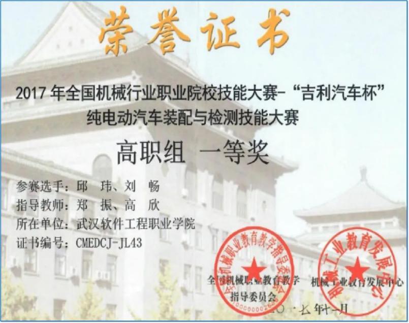 2017年学生荣获全国 “吉利汽车杯”纯电动汽车装配与检测技能大赛团体一等奖。2019年学生荣获第十一届全国交通运输行业汽车维修工(学生组)职业技能大赛湖北省二等奖。