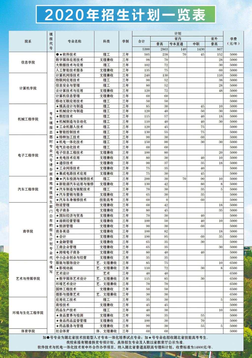 2020年招生专业共54个,招生类别涉及普通文理、中职技能、体育、艺术(美术与设计学),招生的54个专业及方向中,有国家级重点专业9个、省级重点专业4个、省级品牌及特色专业8个、楚天技能名师设岗专业13个、央财支持提升产业服务能力专业2个及教育部现代学徒制试点专业3个。