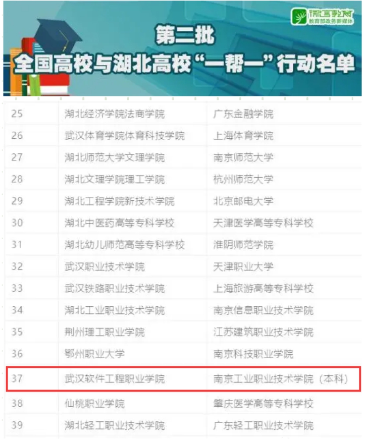 根据教育部办公厅教学厅函 【2020】6号文件关于全国高校与湖北高校毕业生就业创业工作 “一帮一”行动的通知要求,为落实习近平总书记指示批示精神和教育部有关“稳就业”工作精神,南京工业职业技术学院(本科)与武汉软件工程职业学院作为第二批76所结对 “一帮一”互助学校,携手帮扶毕业生就业创业。