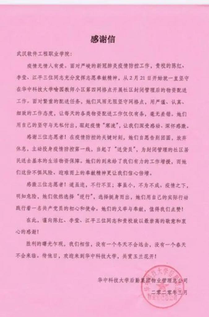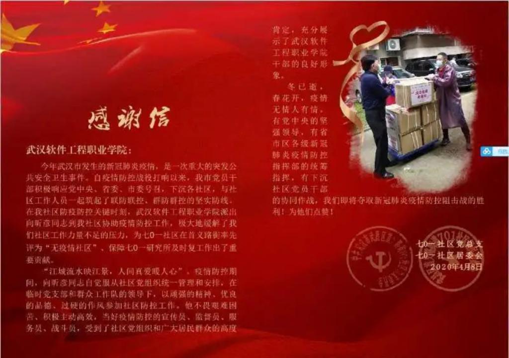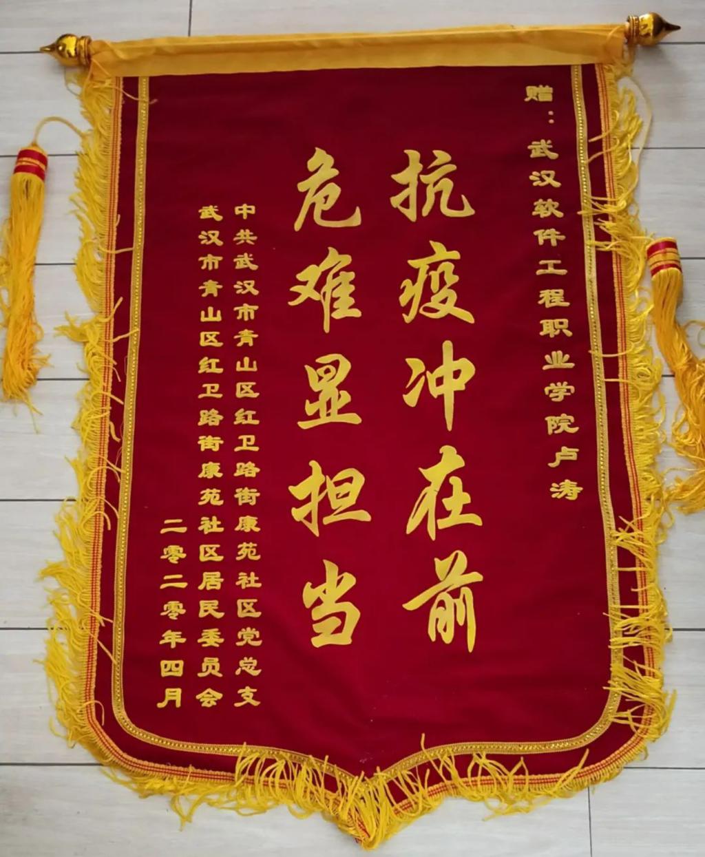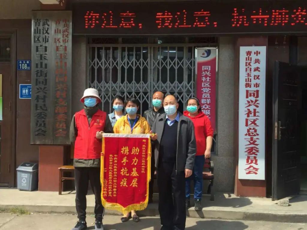 4月8日,华中科技大学校长李元元来到华科大社区服务中心,为我校送上一面印有“抗疫在前线,使命守心间”的锦旗和一封感谢信,向武软战“疫”队对华科大社区所做的贡献表示赞赏和感谢。