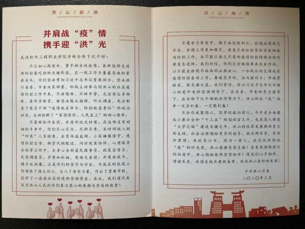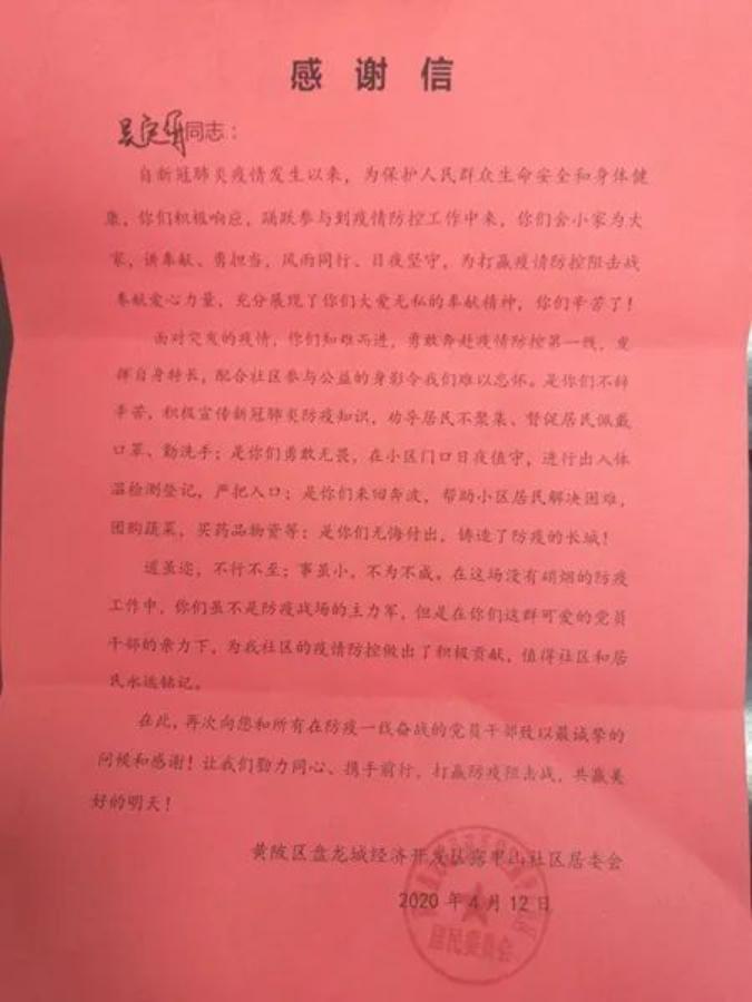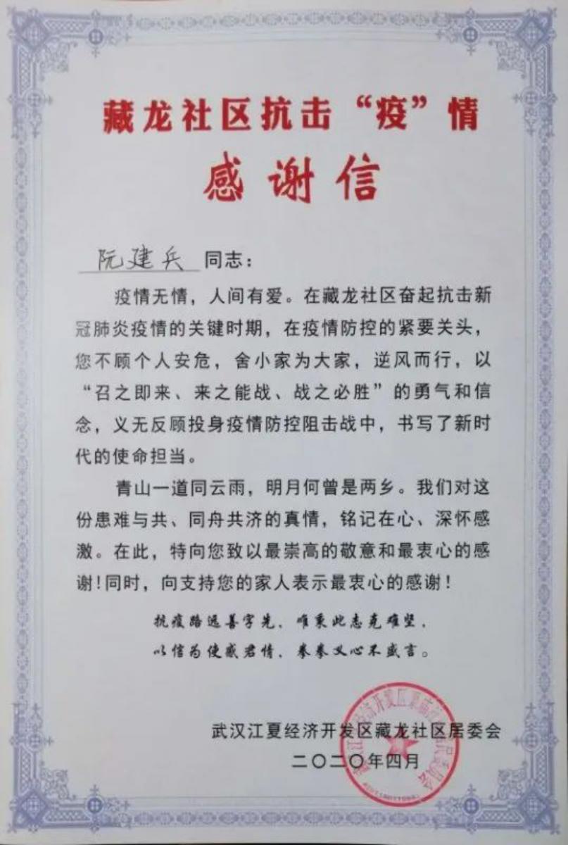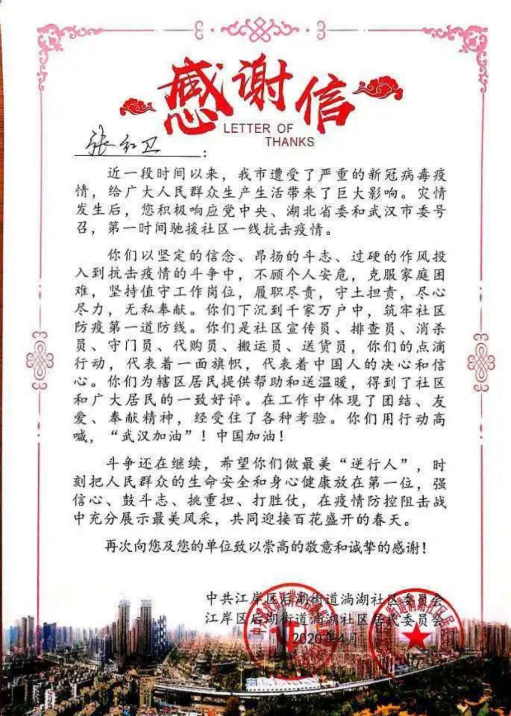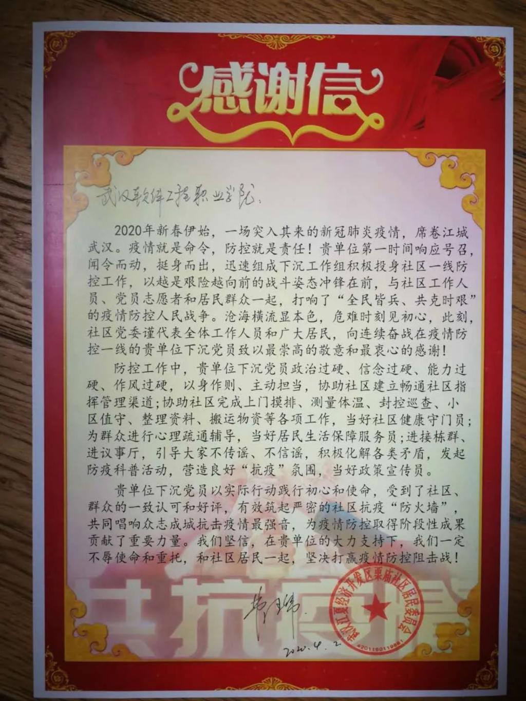 “青山一道同云雨,明月何曾是两乡。我们对这份患难与共、同舟共济的真情,铭记在心、深怀感激。在此,特向您致以最崇高的敬意和最衷心的感谢!同时,向支持您的家人表示最衷心的感谢!抗疫路上善字先,唯秉此志克难坚,以信为使感君情,拳拳义心不盛言。”