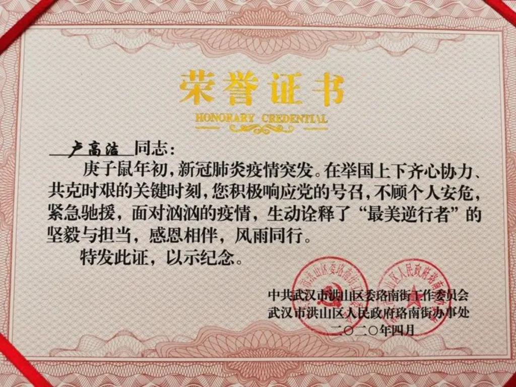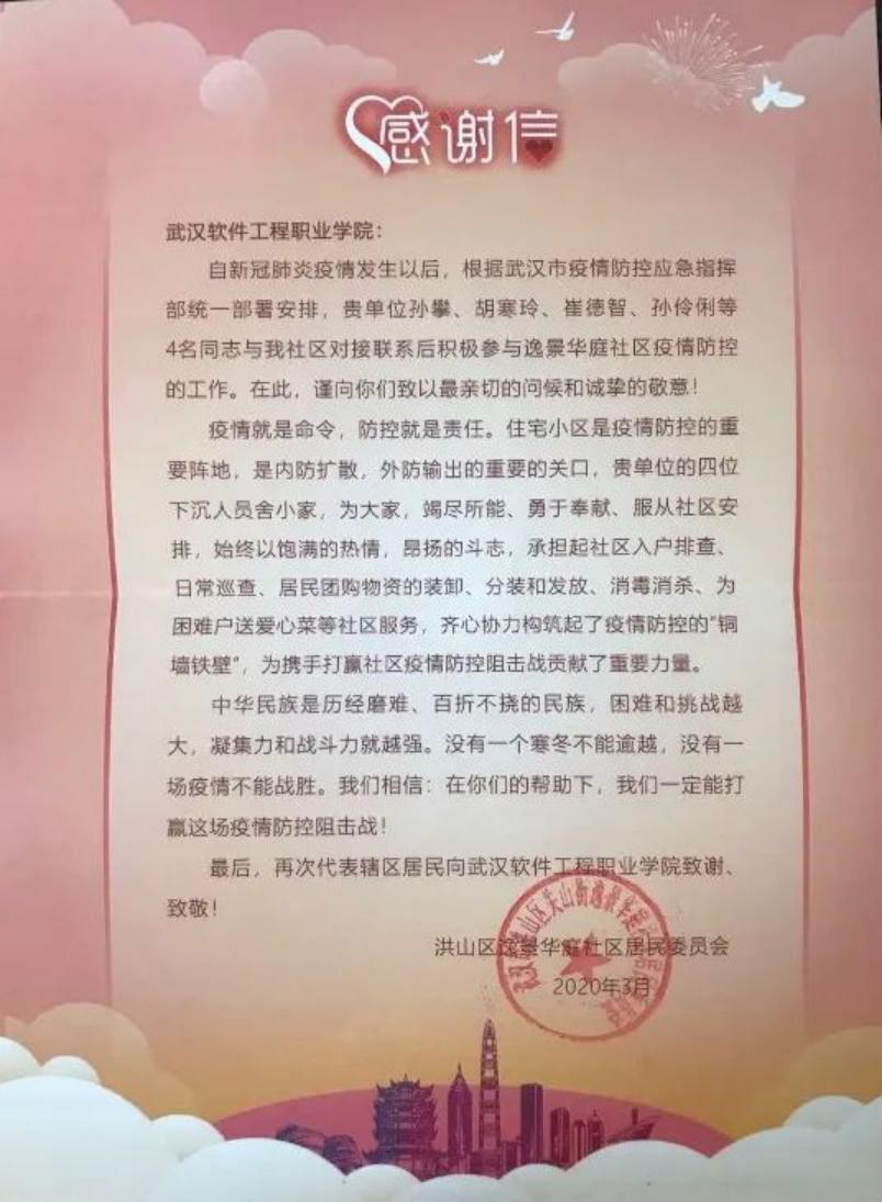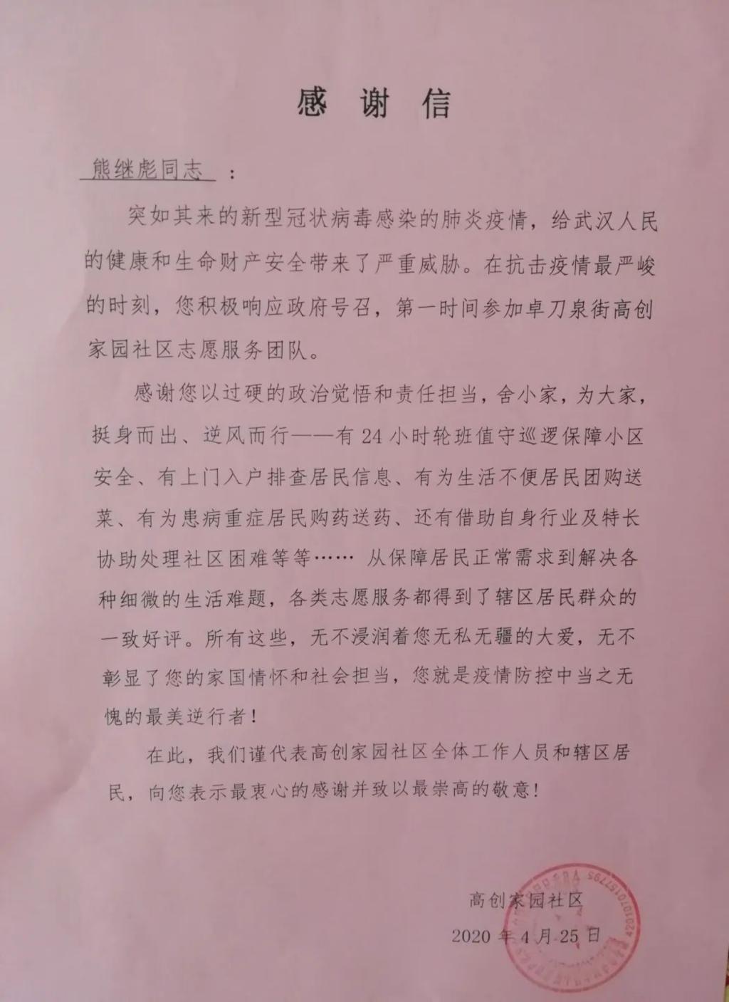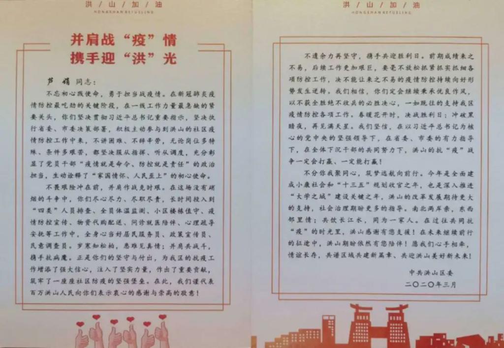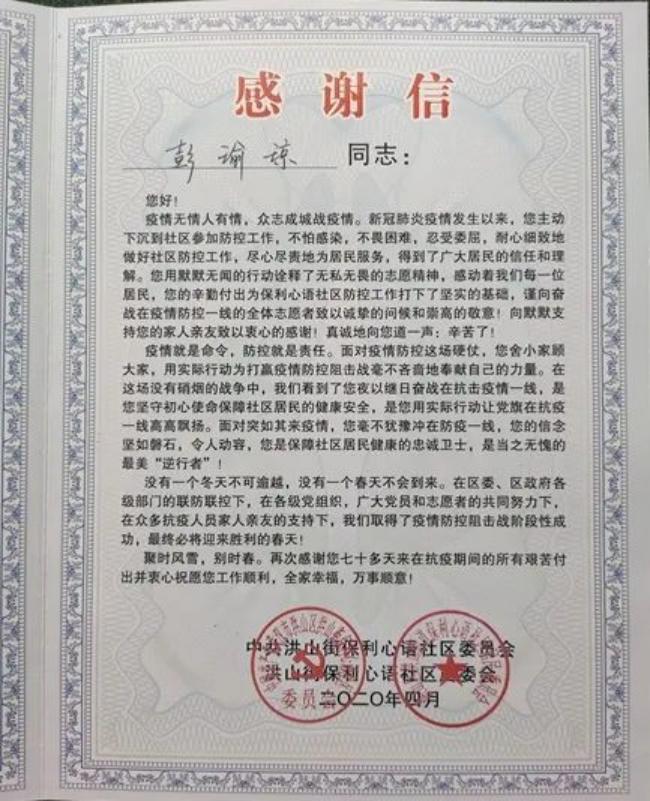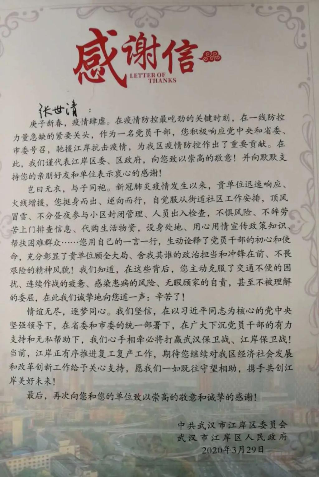“青山一道同云雨,明月何曾是两乡。我们对这份患难与共、同舟共济的真情,铭记在心、深怀感激。在此,特向您致以最崇高的敬意和最衷心的感谢!同时,向支持您的家人表示最衷心的感谢!抗疫路上善字先,唯秉此志克难坚,以信为使感君情,拳拳义心不盛言。”