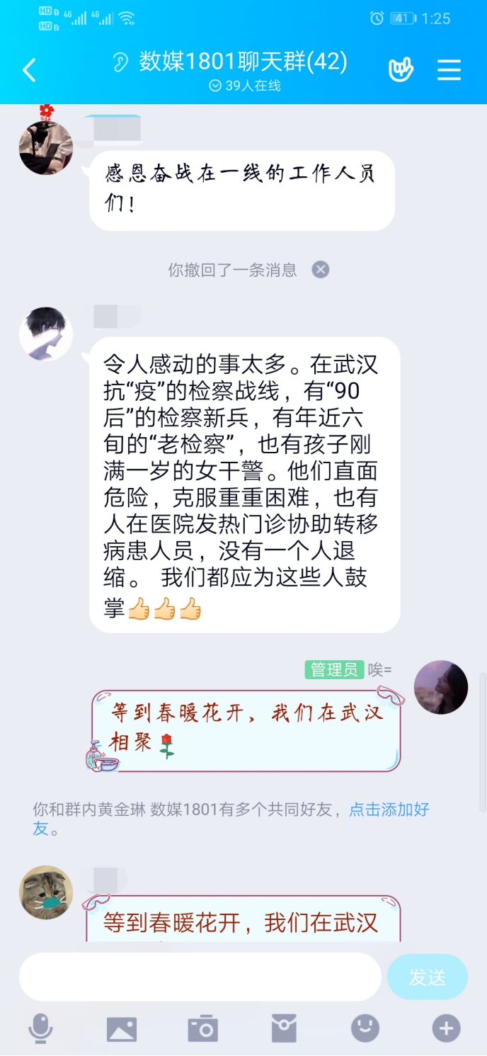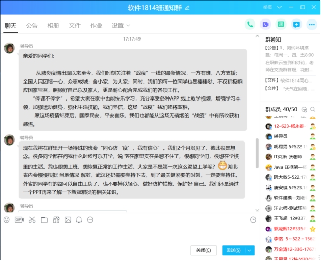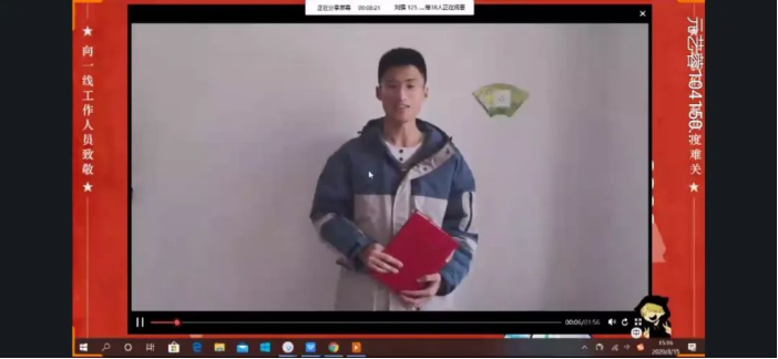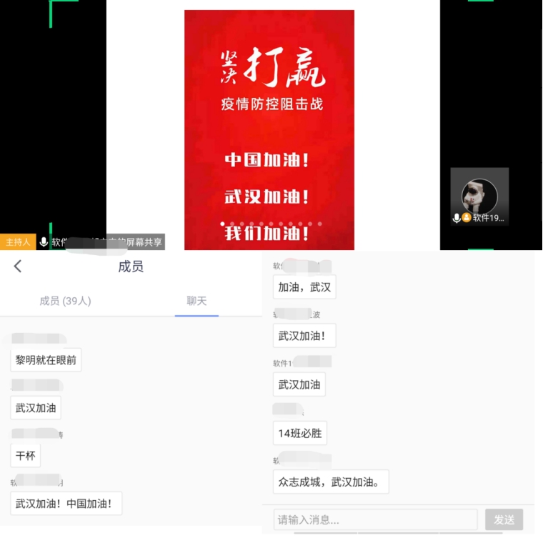 辅导员们或化身主播,或担当QQ讨论群主,虽与学生隔空相望,但心意相通。“云班会”上播放的辅导员共同录制的暖心视频,向同学们表达了祝福和期许,熨帖了大家的心田。防疫主题“云班会”得到了各年级同学的积极响应,大家将自己的爱国之心、报国之志通过绘制书画作品、创作诗句、制作海报、朗诵、视频等形式在班会中集中展示,坚定了战胜疫情的信心和刻苦学习奋斗的态度。其中,软件1916班学生集体录制的《2020我想对武汉说的话》,在师生中广为传播,感人至深。