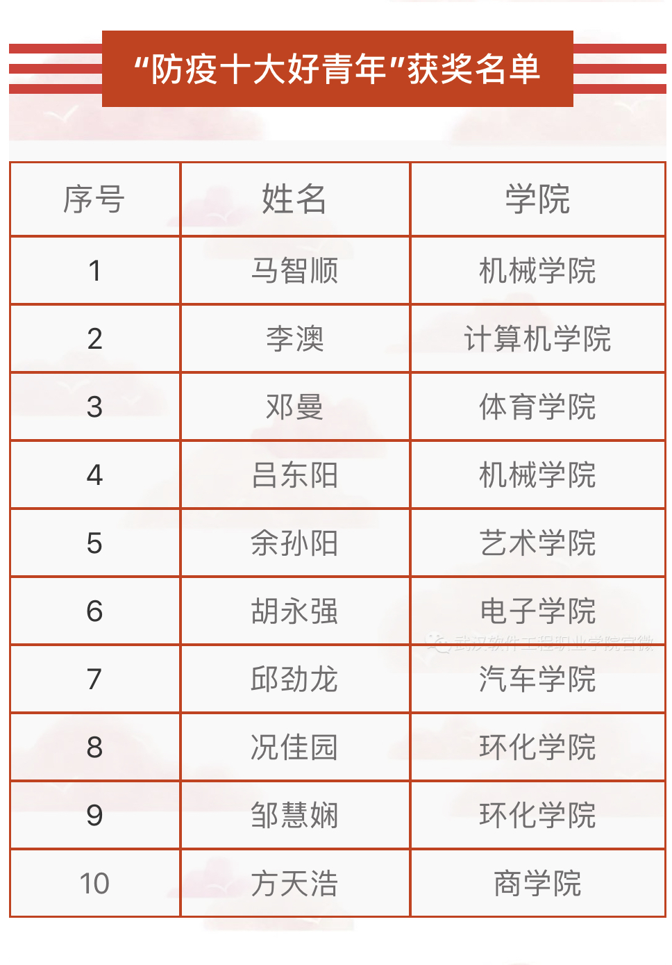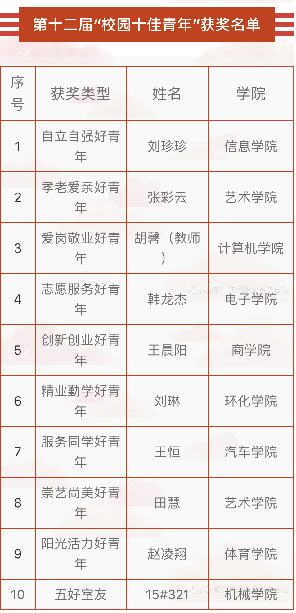 在武软,有这么一群青年,他们坚定自我,不惧困难;他们品学兼优,拼搏进取。他们是新时代青年的先锋,是武软学子的优秀代表,他们就是我校第十二届“校园十佳青年”和“防疫十大好青年”。
