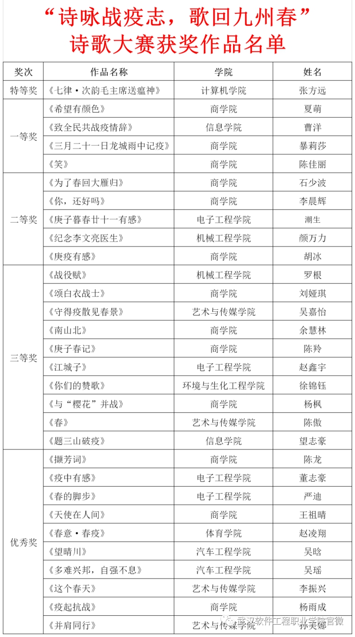 为深入学习贯彻落实习近平新时代中国特色社会主义思想及习近平总书记关于新型冠状病毒肺炎疫情防控工作的系列重要讲话精神,促进新时代校园原创文学的繁荣发展,增强学生的文化自信与认同,我校组织举办了“诗咏战疫志,歌回九州春”诗歌大赛活动,得到同学们的广泛参与,陆续收到诗歌作品来稿共计103篇,通过初审、复审及评奖,现将获奖作品名单公布如下: