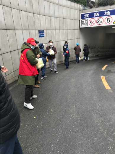 下沉到武展社区的管君把社区工作参与了个遍,门岗值守、圈存天燃气、买药、分拣爱心菜、分发捐赠物资、统计滞留在汉人员、清运垃圾,联系司机接送居民看病等。3月3日,社区与武商量贩对接500份爱心菜,运输车辆无法直接进入超市仓库,社区人员肩并肩,手递手,形成一条30米的爱心接力长龙,将爱心菜运到公交车上。刚装车,又赶往对接小区,把爱心菜分发到居民手中。居民的“谢谢”,让她感觉沐浴在暖阳中。