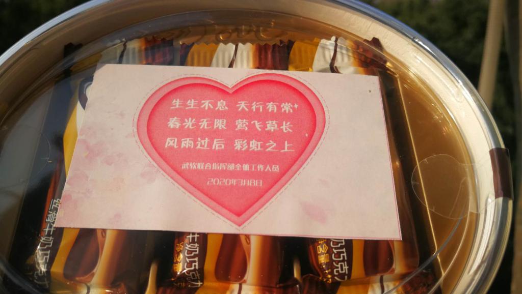 在这里,康复隔离人员不仅得到专业的医疗,也受到了亲人般贴心的照顾。学校提供外围安保、网络保障、热水供应、设备维修、心理咨询等服务,加上可口的三餐两点,还有不时送上的小惊喜,如妇女节礼物巧克力、难得吃到的热干面、武软学子的慰问信等。
