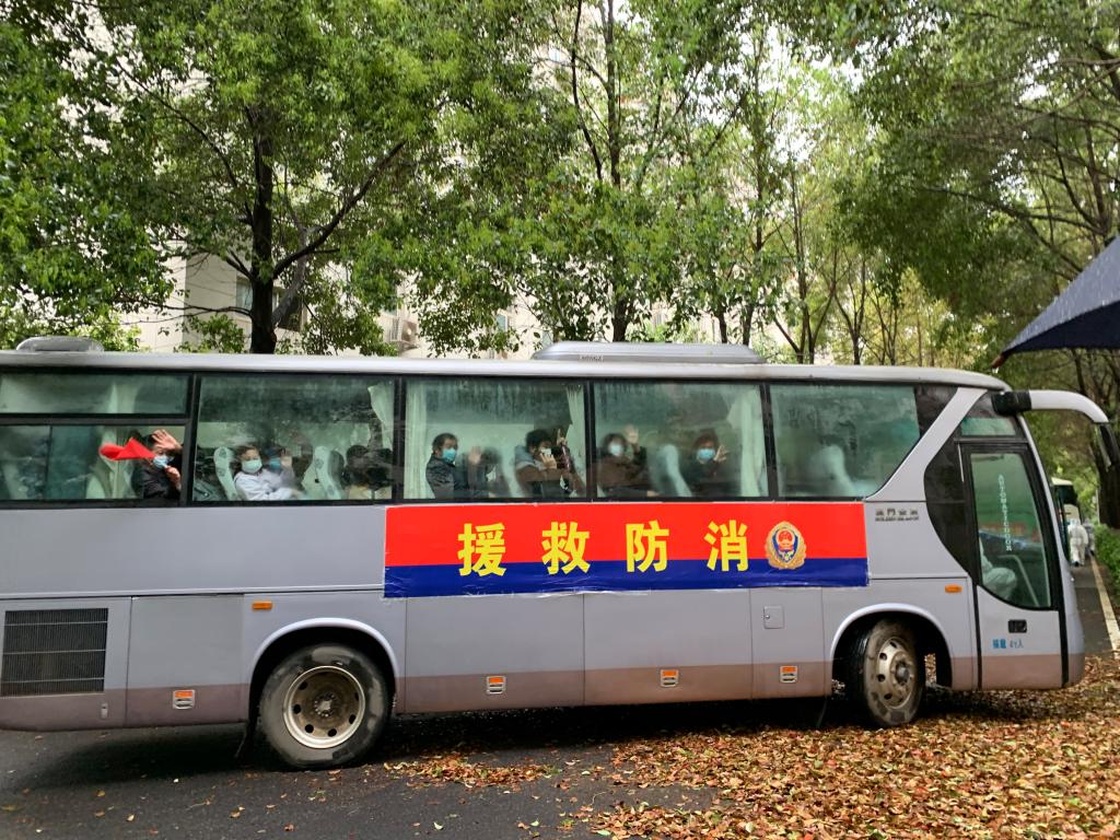 3月27日7:30,武汉软件工程职业学院康复驿站最后一批共102名康复隔离人员走出宿舍,登上在门口接送的大巴,挥手向这个只呆了14天却注定终身难忘的地方告别。