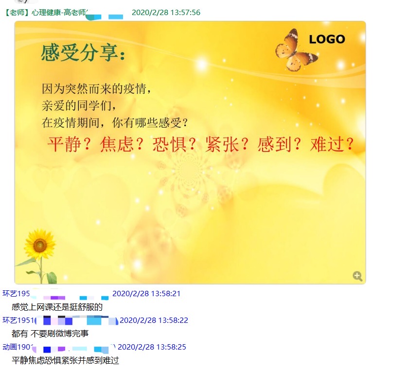 这段时间,除了下沉社区和开展心理辅导专项工作,作为《心理健康教育》的老师和信息学院学生科科长,高娟还要兼顾网络教学、学生管理等工作。课堂上,她通过调查、提问、互动,让学生表达自己在疫情期间的情绪状态,学生在QQ群通过文字形式,讲述自己从开始的担心、焦虑到后来的积极、从容。生活里,对于疫情期间学生出现的不确定感、疑病、歧视、崩溃等,她积极开展疫情健康知识普及,让学生不要害怕,学会接纳自己的情绪反应,找到生活中有意义和价值的事情。她坚信:“用心战‘疫’,守护学生心灵,我们一定会重逢在美丽的武软校园。”