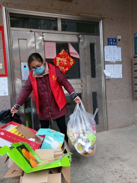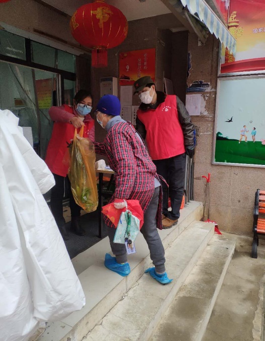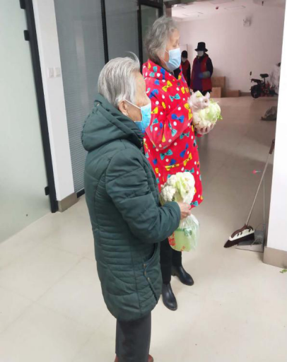 志愿者将爱心花菜送到社区老人手中
