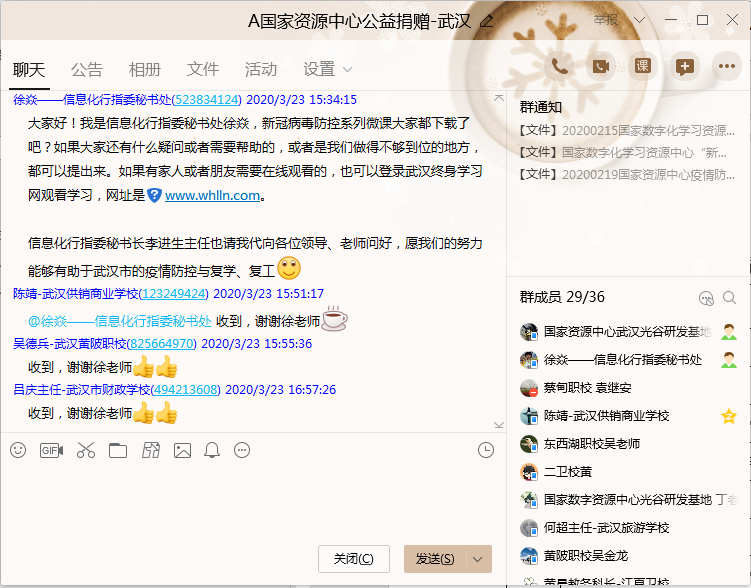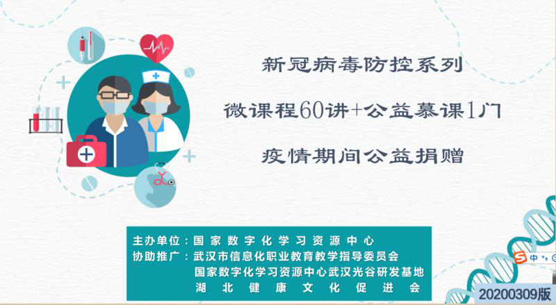 此外,作为武汉市信息化职业教育教学指导委员会的秘书处,我校联合国家数字化学习资源中心武汉光谷研发基地和湖北健康文化促进会,对国家数字化学习资源中心的《新型冠状病毒防控公益课程》系列60个微课和1门慕课,通过“线上+线下”模式,不遗余力向个人和中职学校进行公益推广使用。截至3月23日,已成功对接31所中职学校,并以“实体资源交付”模式进行捐赠使用。
