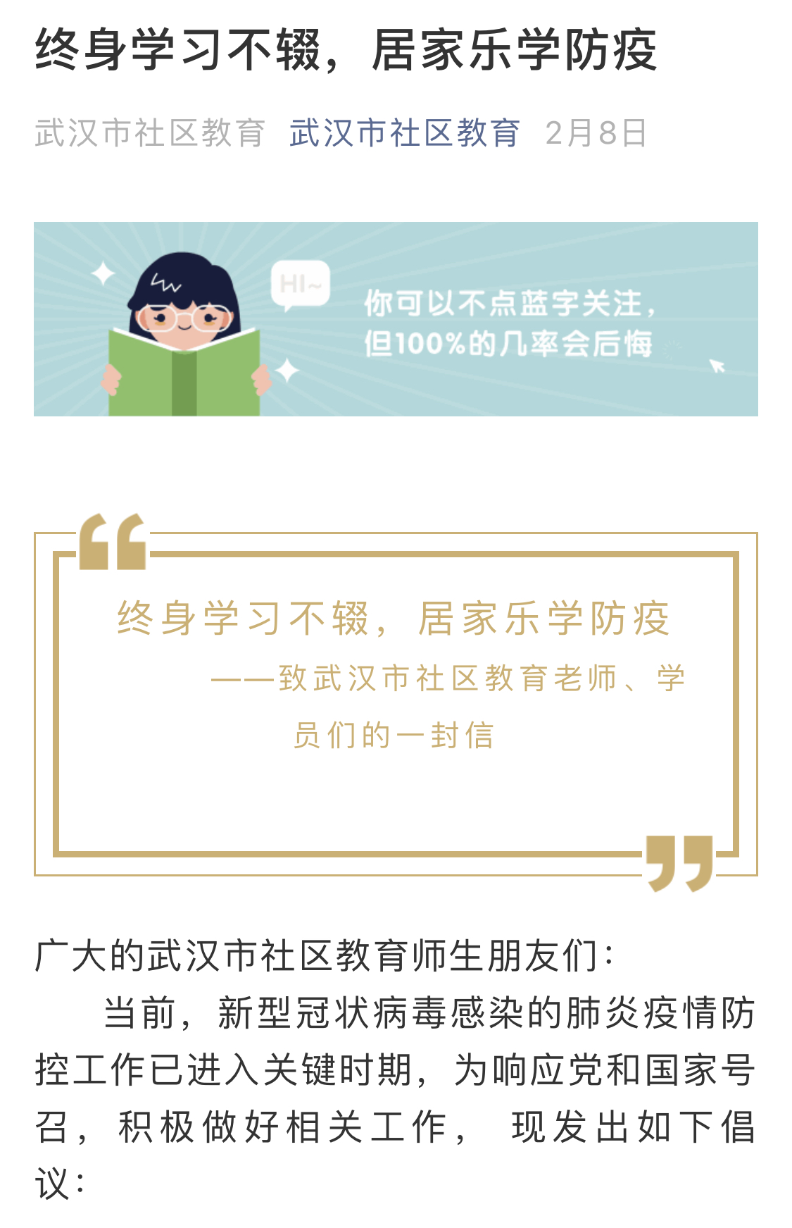 疫情发生后不久,我校(武汉市社区教学学院)第一时间发布《终身学习不辍,居家乐学防疫——致武汉市社区教育师生的一封信》,倡议全市广大居民理性应对、科学预防,正确对待新冠肺炎疫情,保持良好心态,借助互联网和移动终端设备进行学习。通过倡议书,让社区教育战线的教师、学员凝心聚力,与广大社区居民一起共同打赢疫情防控阻击战。