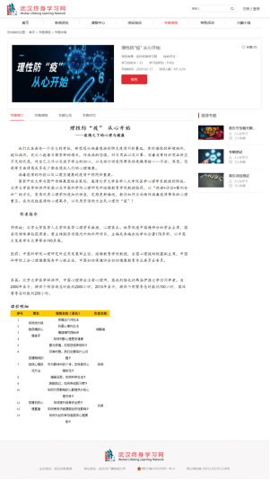 为进一步提高学习品质,我校还主动联系国家数字化学习资源中心和国家开放大学,获取《理性防“疫” 从心开始》系列、《新型冠状病毒科学防疫》系列以及《“开学前第一课”教你科学预防新冠肺炎》等共计74个防疫相关微课,及时在武汉终身学习网建立“抗击肺炎”课程类别和“理性防‘疫’ 从心开始”专题,免费提供给广大市民。同时借助学习型城市建设成员单位资源,将文字、图片、视频紧密融合,向市民发布学习信息,如推送市图书馆的《图书馆百门名家公益免费课程》,包含了全球顶尖艺术家教授的100门课程,总时长超100小时。