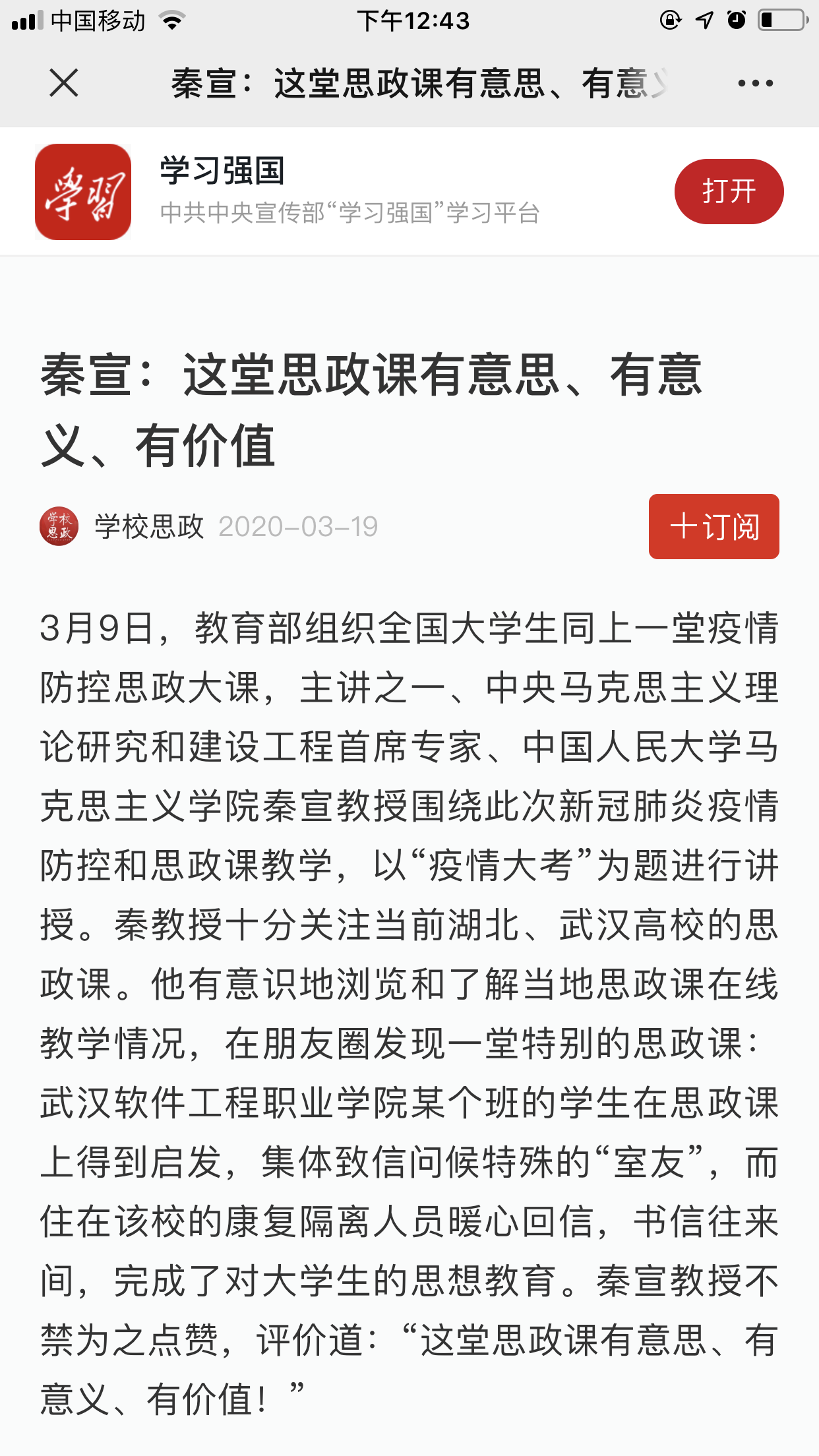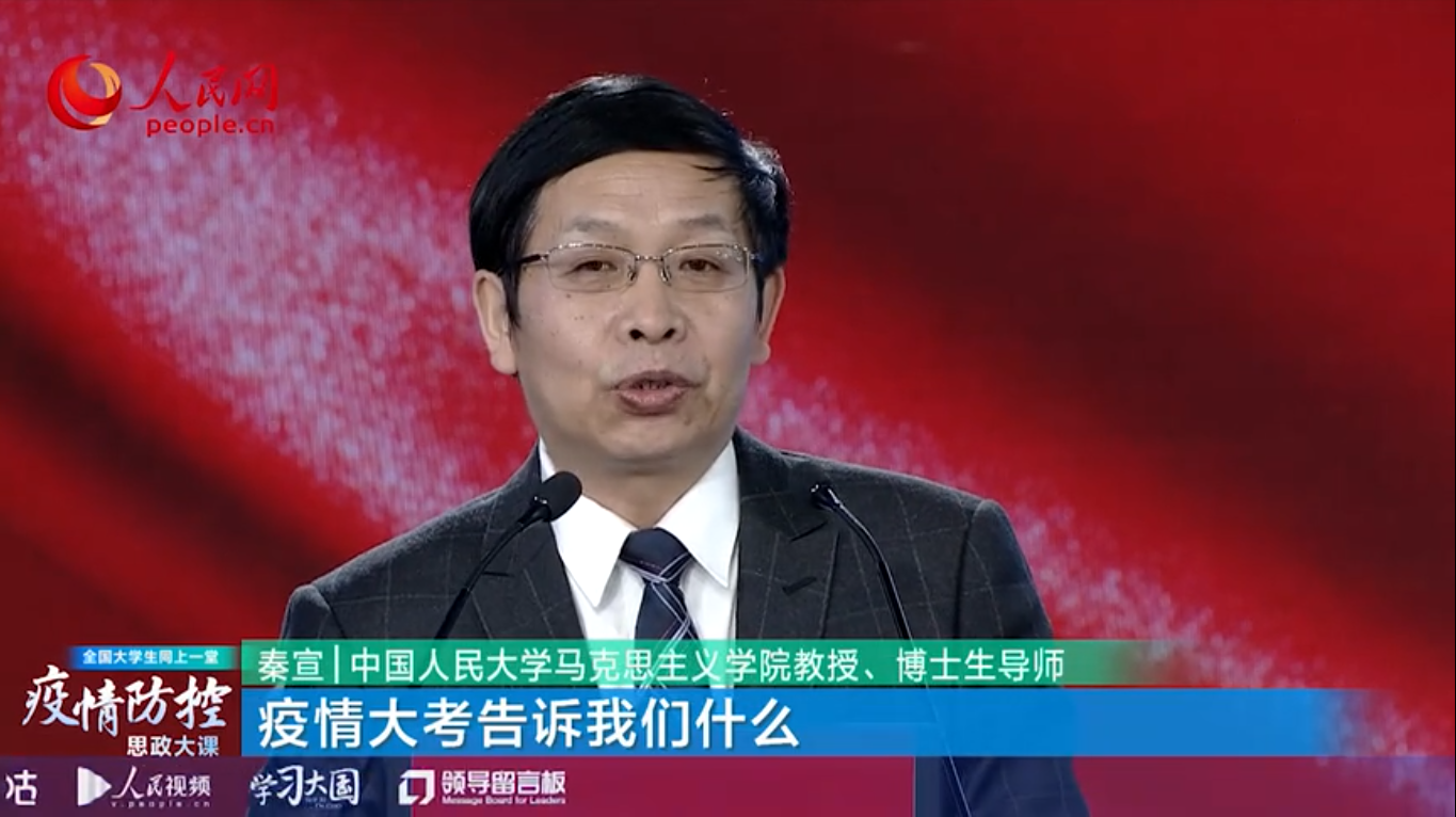 教育部组织的疫情防控思政大课主讲之一,中央马克思主义理论研究和建设工程首席专家、中国人民大学马克思主义学院秦宣教授为此点赞,评价道:“这堂思政课有意思、有意义、有价值!”