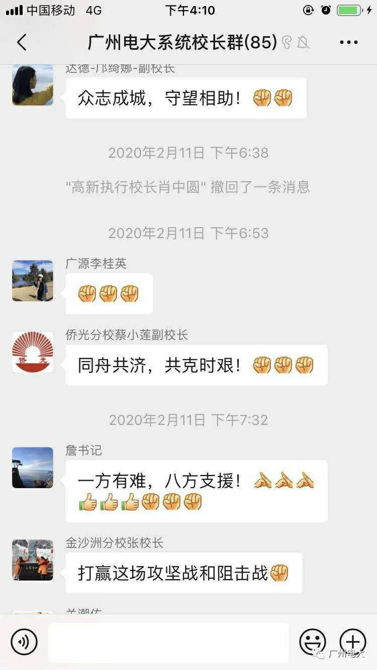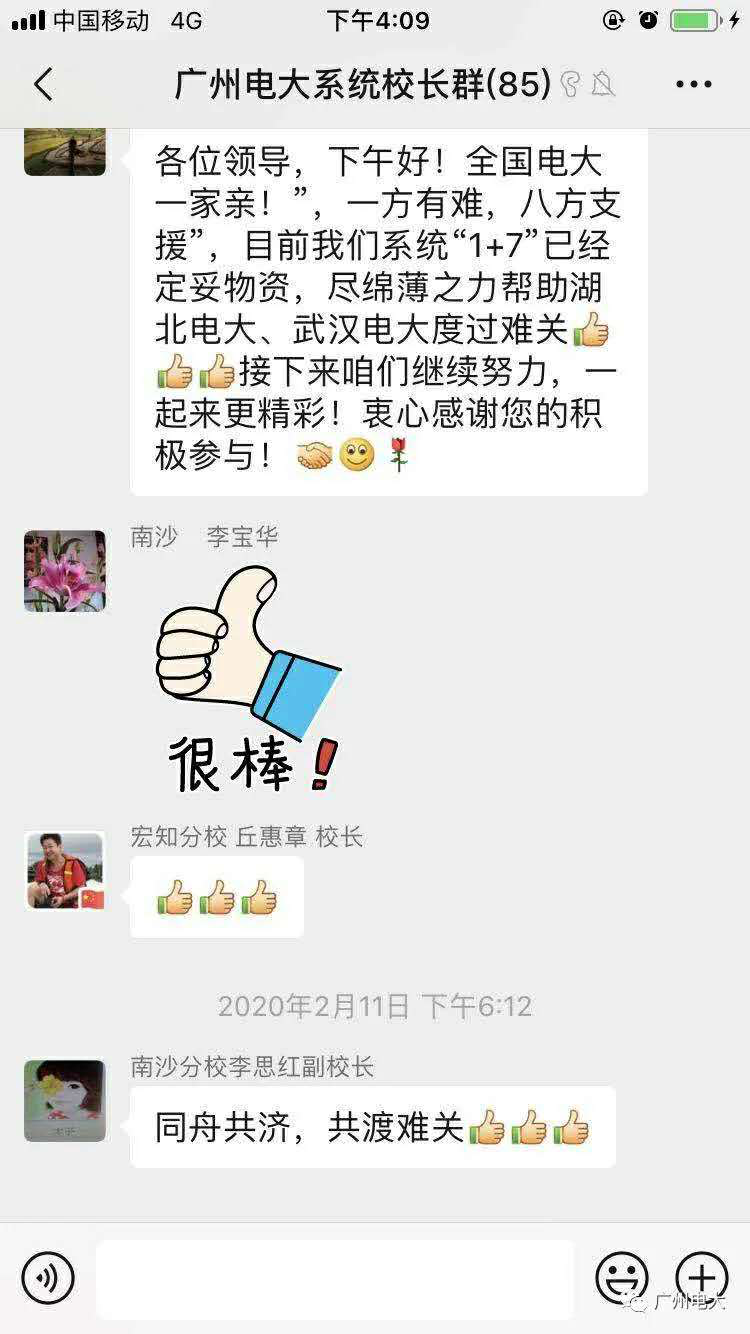 事后我校才得知,广州电大校党委2月10日收到来自总部的倡议后,当天上午11:50紧急开会研究,党委书记詹德村指示“要急人所急,和时间赛跑”;下午16:30即向系统发出捐赠倡议;次日上午10点46分,第一批物资启运武汉,前后不到23个小时!其时羊城防控物资也告急,广州电大再一次展现了“系统是广播电视大学最凝聚的力量”, 全市15家分校即刻有钱出钱,有力出力,达德、中奥、远智等分校的校长们更是亲自联系、亲自采购、亲自办理发运手续,为找防控物资,省内没有就找到广西、安徽、山东,国内没有就找到韩国、越南。