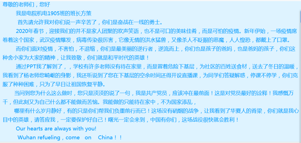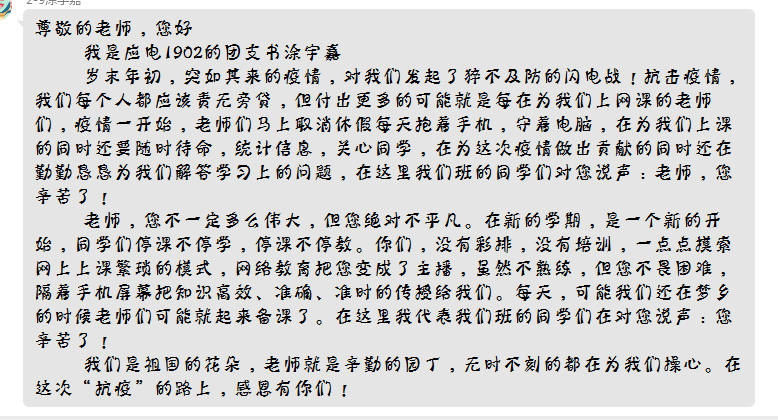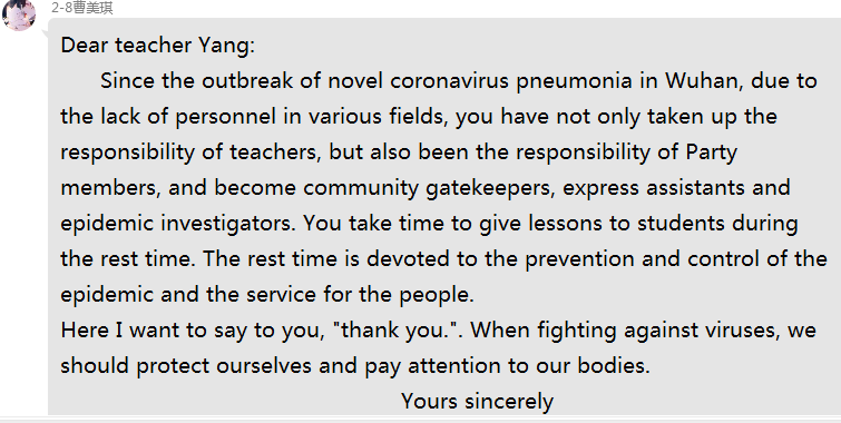 领头“杨”的故事在每一门公共课中悄然传递,在云端教学中绽放思政之花。在19级学生群中,我们看到一封封感人肺腑的学生留言: