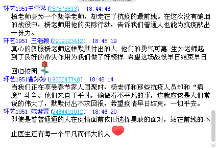 (通讯员 刘春梅)“杨老师是我们的榜样,在这种危难时刻,以身作则.哪有什么岁月静好,只不过有人替你负重前行,杨老师是新时代最美的逆行者,是我们心中最可敬的英雄!” 这是我校机自1903班孙子杰同学在QQ群中的留言,这样的留言还有很多很多。