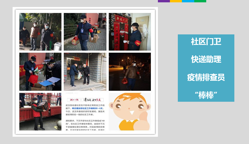 开学之初,人文学院制定“青春战疫”人文教育系列活动,“武软战疫群英谱”就是其中之一。采编参加战“疫”老师的故事,制作统一的PPT、音视频,在公共必修课中用10分钟给学生播讲,一周一故事。领头“杨”杨树清老师是人文学院数学教研室主任、学院党总支第一党支部书记,是省数学建模大赛一等奖指导教师,也是卓刀泉街社区的志愿者、门卫、快递助理、疫情排查员、为小区居民搬菜、搬米、搬油的“棒棒”。为了兼顾社区防疫工作和线上教学,杨老师把上课时间调整为中午12:00-14:00和晚上19:00-21:00,55岁的杨教授的生活被防疫和上课备课填满。