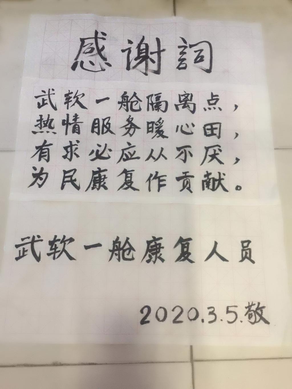 还有位朋友,在宿舍用毛笔手书一封感谢词:“武软一舱隔离点,热情服务暖心田,有求必应从不厌,为民康复作贡献。”