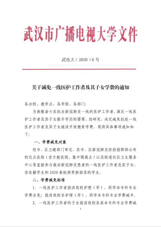 3月4日,校长办公会审议通过了《武汉市广播电视大学关于减免一线医护人员及其子女学费的通知》,各分校(教学点)在接到通知后纷纷点赞,表示坚决支持,全力推进。新洲分校招生负责人熊幺林老师说:“这种做法非常值得肯定,在社会上传播了正能量”,湖北中南职校教学点校长周勋伟也称:“上一线的医护人员就是上战场的战士,我们坚决支持市校的决定。”而更多的老师则希望给一线的同学们喊话:“学费学校给大家减免,拉下的课老师给大家补,我们在电大等着大家胜利归来!”