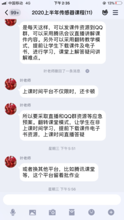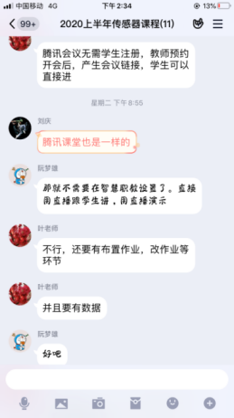 为保证教学质量,达到良好授课效果,机电教研室“传感器应用技术”课程负责人叶茎老师,指导课程团队分工合作、开展网上教学。教师团队建设了智慧职教平台的多样化在线教学资源,设计了腾讯会议、腾讯课堂直播、QQ群辅导答疑等多种在线教学方式,引入翻转课堂等教学模式。叶茎老师把好的课前导学设计、重难点讨论话题、在线课堂教学活动设计发在团队交流群里给大家参考,对一周教学进行交流总结。