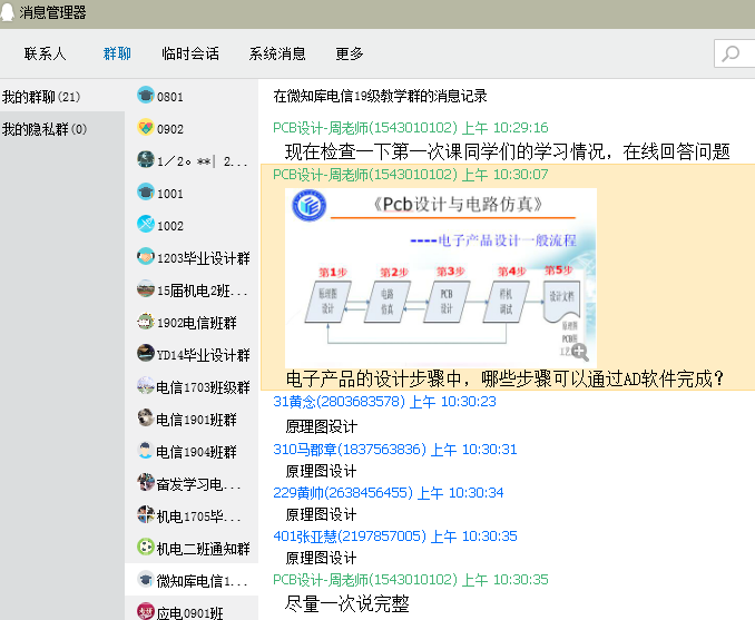 应电教研室的周福平老师下沉在东亭社区服务,同时也积极准备网上教学。第一次课,他利用微知库完成教学,发现单纯利用该资源,不能使所有学生直观感受到AD软件的使用平台,尤其是少数没有电脑、没装软件的同学。因此,周老师在第二次教学时立刻修正思路,改进教学手段,引入“腾讯课堂”进行直播,并对微知库、腾讯课堂、AD软件、PPT之间的组织与协调进行周密的设计。学生在QQ群中提出的疑问,他一一进行讲解,使学生对当堂课程能当堂消化。每次下课时间到了,同学们都还意犹未尽。