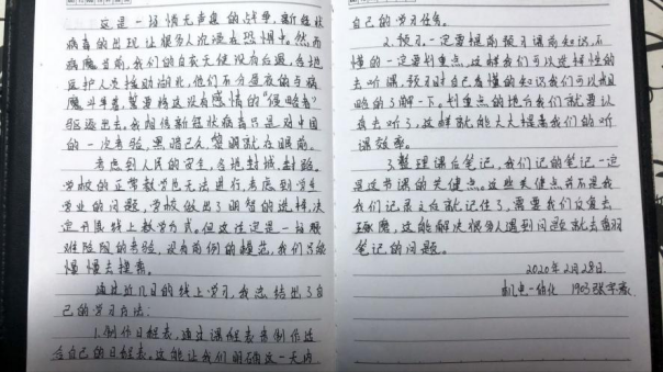 机电1903班的张宇豪总结了自己的学习方法分享给专业同学:线上学习首先制作日程表,明确一天内的学习任务;其次要提前预习,对不懂的要划重点,在上课时划重点的地方就要认真听,这样能大大提高听课效率;最后是整理课后笔记,所记笔记一定是这节课的关键点,记下后还要反复琢磨,随时和老师线上沟通,直到真正掌握。