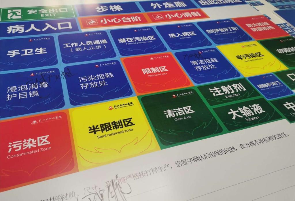 胡明迅速整合思路,综合素材,很快确定用红、白两色作为标志的主色,红色代表着生命力,白色代表被称为“白衣天使”的医护人员。标志主体图形是双手托着红十字,双手合拢意味着呵护与关爱,既代表医护人员对生命的呵护,也象征着全国各地对武汉的支援,双手图案适当变形为火焰,贴合医院名字。红十字传达出以病人为中心,全方位为病人提供优质服务的理念,四颗红心代表对病人的爱心、耐心、细心和责任心。医院中文名字则采用兼具端庄秀美和挺拔劲健的郭沫若手写体。设计稿交上去之后,很快就通过了,胡明在此基础上又做出了医院标识系统的基础系统,便于公司尽快完成区域划分和指示系统的制作安装。这一套标识系统随后又被应用到“雷神山医院”。