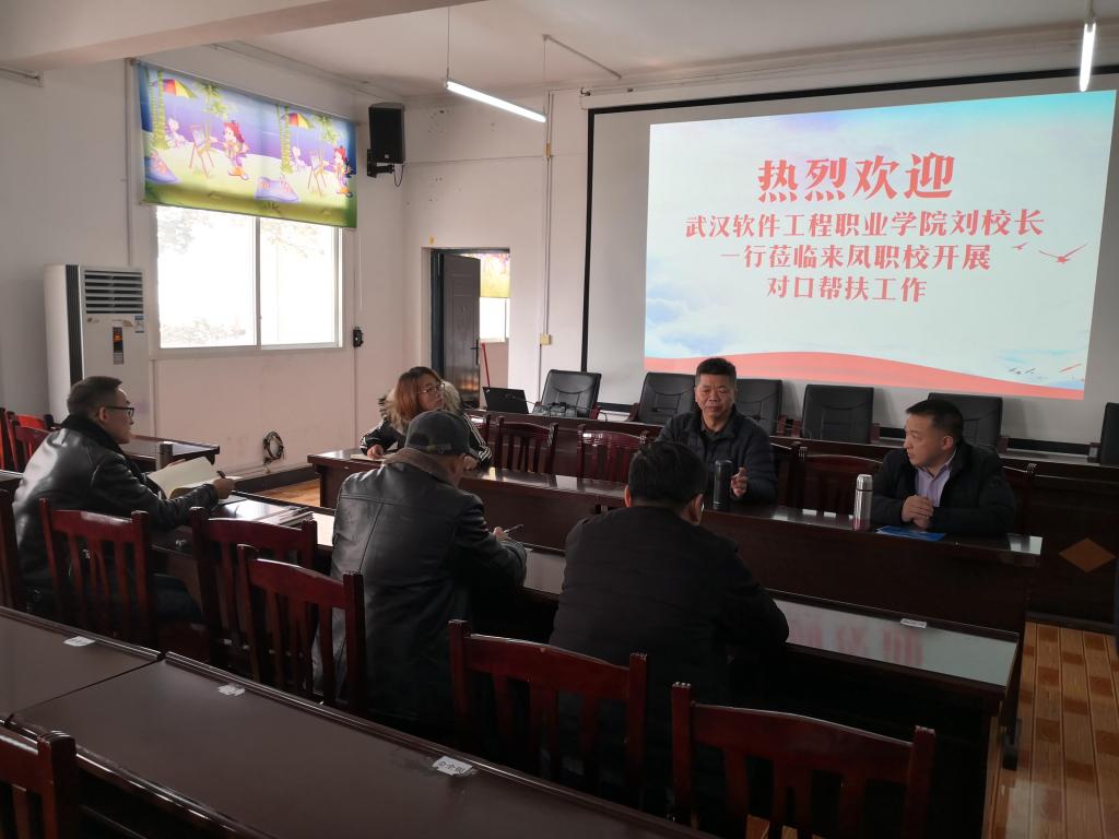 13日上午,刘前信校长一行前往来凤县中等职业技术学校。来凤县副县长陈英明,省民政厅驻村队长、九三学社湖北省委科技部部长赵良栋,来凤县中等职业技术学校校长翁明章等对我校的到访表示热烈欢迎。翁校长介绍了县情、校情,对我校在专业建设、师资培训、实训室建设及学生帮扶等方面长期以来的支持与帮助表示感谢,并提出下一步帮扶工作诉求。