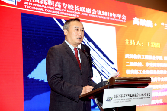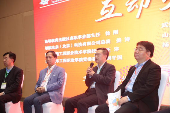 刘前信校长作为嘉宾上台和与会人员互动交流。他指出,武汉是国家中部崛起战略的中心,学校必须优化专业群布局对接区域产业发展,加强专业建设、深化三教改革,立德树人,助推武汉经济社会高质量发展。
