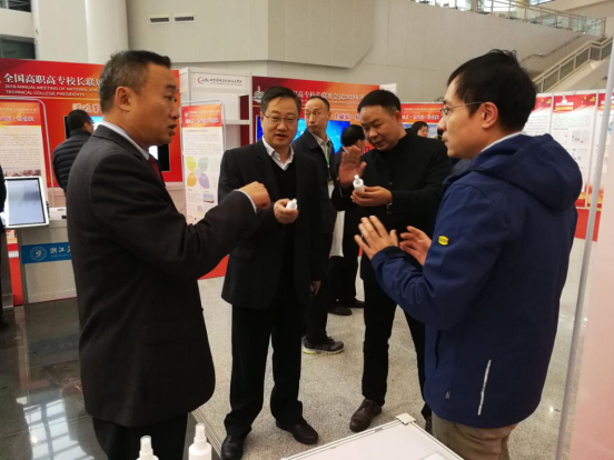 在全国高等职业教育改革发展成果展览区,我校的“数字媒体应用技术专业——虚拟现实技术教育先行者”展板充分展现了运用新技术实施教学改革的经验成效。在技术研发与应用成果展览区,我校环境与生化工程学院、武汉市药物增溶中心研发上市的新药“本维莫德乳膏”“玻璃防水剂”等专利产品吸引了很多参会代表驻足观看与了解。
