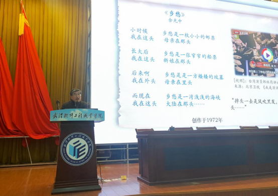 万国邦副校长首先以闻一多的《七子之歌》和余光中的《乡愁》这两首诗开场,进入报告的主题。他从两岸关系取得的历史性成就和突破性进展,深刻领会习近平总书记重要讲话精神的核心要义和奋发有为做好新时代对台工作三个方面展开论述。万国邦副校长以一个过来人和亲历者的身份向同学们叙述两岸关系的历史、现在和未来。