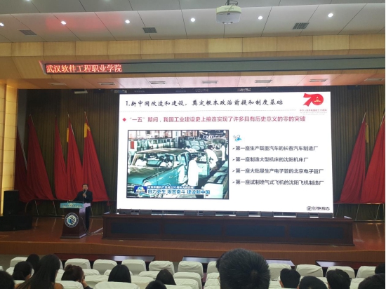 王路群副校长用一个个鲜活的事例、一组组详实的数据来说明讲解,既生动活泼,又令人信服,学生反响热烈。报告让学生全面认识昔日国弱民穷的中国发生的历史剧变,让学生充分认识到,70年我们取得的一切成就是一代又一代中国人民持续奋斗的结果。激励学生把爱国精神转化为实际行动,为实现“两个一百年”奋斗目标,实现中华民族伟大复兴中国梦而不懈奋斗。