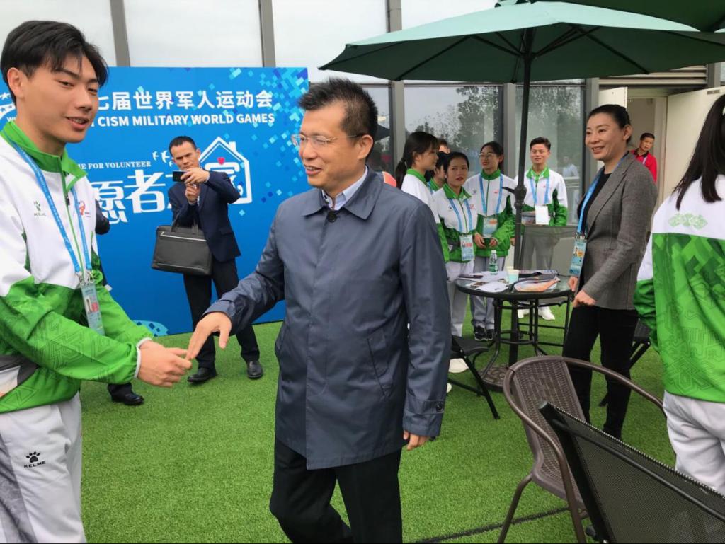 陶宏厅长早早地来到摔跤场馆,与国际军体摔跤项目委员会主任马尔科•科佩拉亲切交谈,在得知摔跤赛事工作得到国际军体、国际摔联的一致认可和好评时,十分高兴地称赞武软师生出色的工作。他说,中国“八一”摔跤队不畏强手、敢于拼搏、勇夺金牌的精神值得广大师生学习,这次摔跤比赛正是进行爱国主义教育最好的一课。他鼓励大家再接再厉,为军运会摔跤赛事画上圆满句号,并用这种全力以赴、精益求精的精神做好今后的工作,更好地推进学校优质发展。