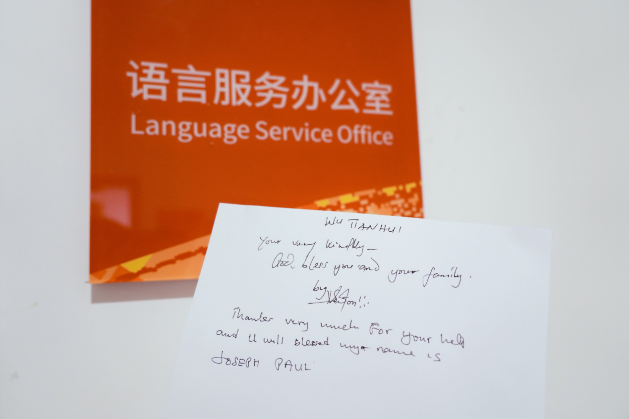 语言服务志愿者吴天慧老师收到了一封来自坦桑尼亚运动员JOSEPH PAUL的感谢信。信中这样写道:”你是一个非常善良的人,很感谢你的帮助。”他的手机出了问题,吴天慧主动带他到就近维修点进行修理。他表示,在摔跤场馆比赛进程中,感受到了武汉人的友好与热情,我很满意,武汉很棒。