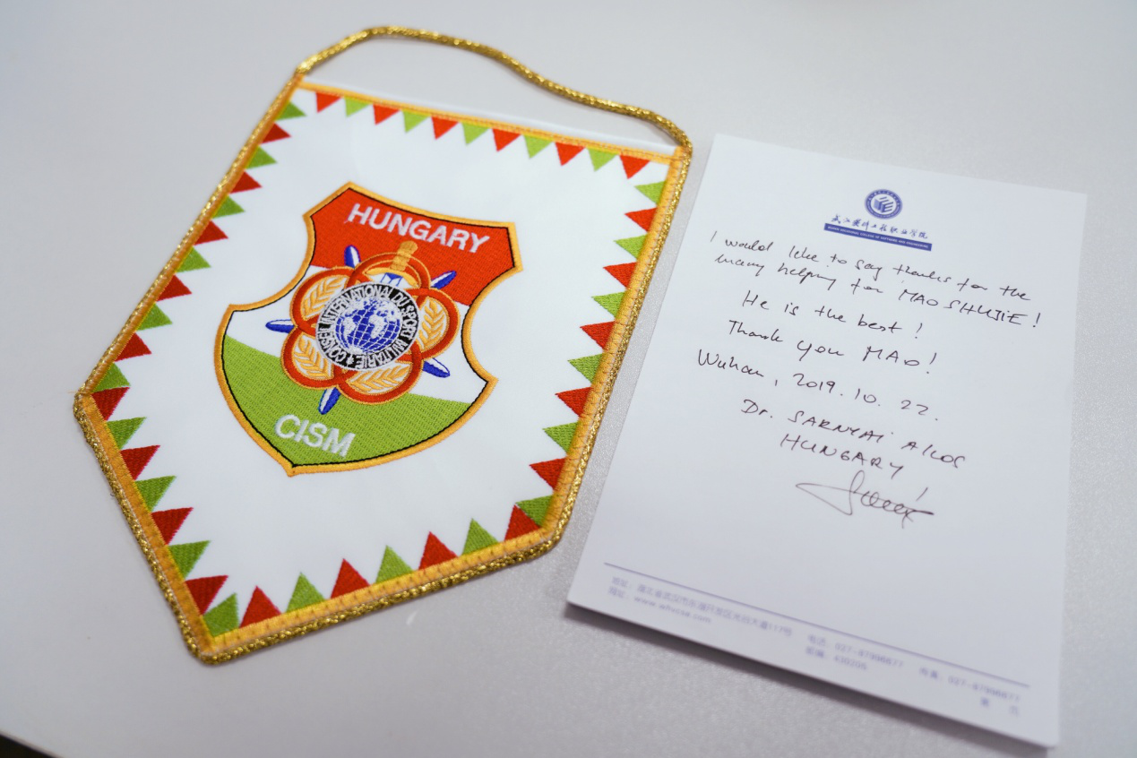 无独有偶,匈牙利教练员AKOS SARNYAI DR.表示,他在摔跤场馆呆了两天,不管是咨询竞赛日程、班车时间,还是询问周边环境、餐饮美食等,都得到了语言志愿服务者毛述劼老师热情、细致的服务。对此,他特别手写了一封感谢信并赠送一面匈牙利小国旗,信中说:“你是最棒的,非常感谢你为我提供了很多帮助”。