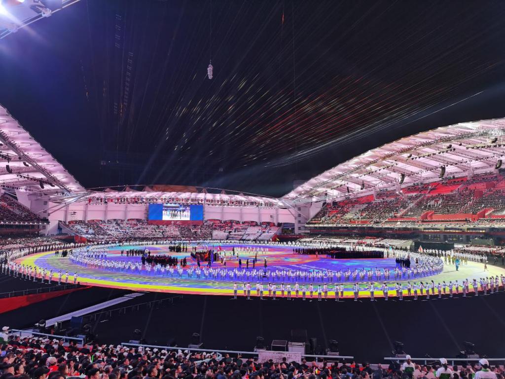 晚上8点,一面巨大的五星红旗伴随着激昂的鼓点声徐徐展开,连绵起伏。伴随着动作变化,金色五星幻化为巨大的汉字“中国”,以此献礼新中国成立70周年,欢迎四海宾客共赴江城之约。在五星红旗与军运会会旗的依次入场后,各国运动员闪亮登场,第七届世界军人运动会组委会主席许其亮、国际军事体育理事会主席赫尔维.皮奇里洛分别致辞,国际奥林匹克委员会主席托马斯.巴赫视频致辞,在运动员、裁判员代表宣誓后,中共中央总书记、中华人民共和国主席、中央军委主席习近平同志宣布开幕。