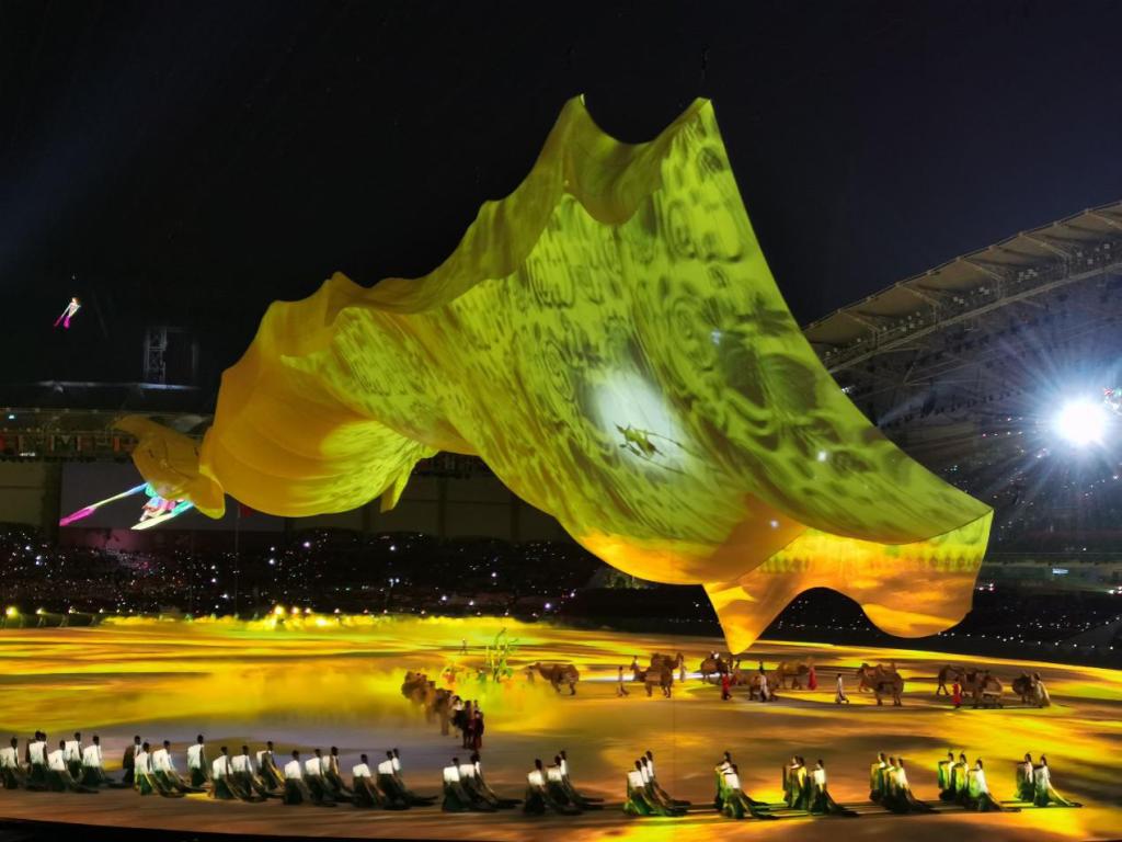 和平薪火、星光点点。文艺表演《和平的薪火》拉开序幕,整个开幕式文艺表演分为上篇《泱泱华夏.生生不息》和下篇《路路相连.美美与共》。光影与人物交织,历史与现实交汇,开幕式现场“如梦如幻”。 整个文艺演出围绕和平这一主题展开。最后在象征着“五大洲”的主火炬塔塔顶,圣火瞬间绽放后,开幕式在主题歌《和平的薪火》中结束。