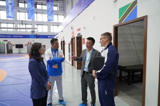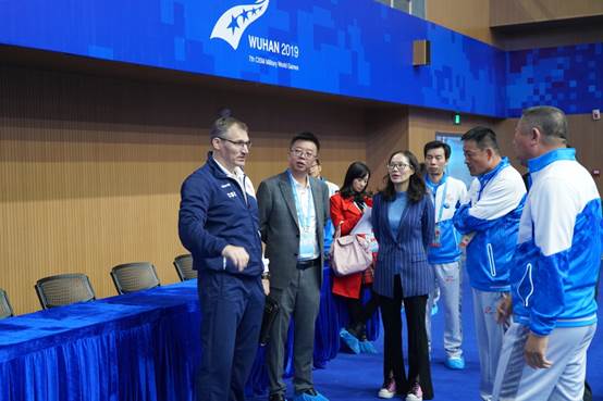 在贵宾室,军方代表、摔跤竞委会副主任黄国明,摔跤竞委会副主任、副校长孙美华和马尔科先生就开幕仪式、颁奖仪式运动员着装、运动员抽签方式、观众行为规范等军运会筹备工作细节进行沟通和协调。