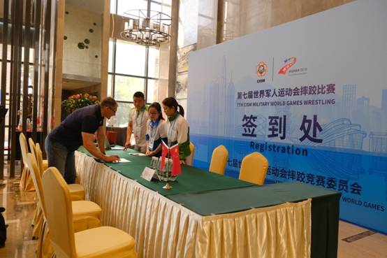 在下榻酒店迎接马尔科先生的还有军方代表、第七届军运会摔跤竞赛委员会副主任黄国明,摔跤竞委会执行主任、校长刘前信。马尔科介绍,本届军运会摔跤比赛参赛国达到45个,打破了以往最多37个参赛国的纪录。