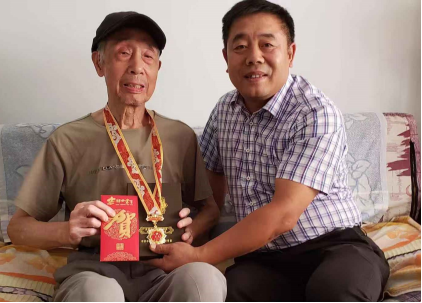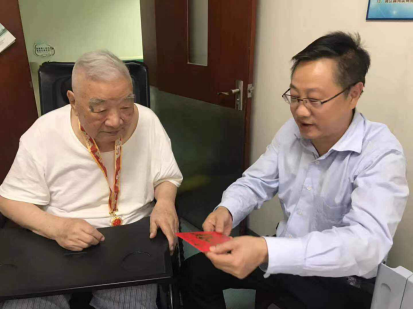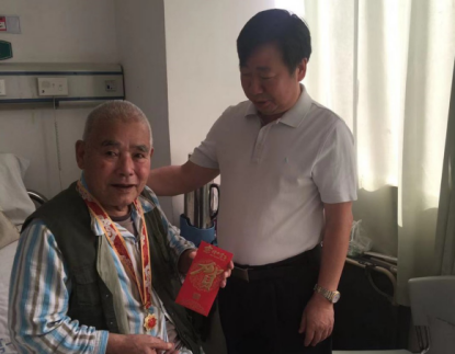 来到老干部身边,校领导郑重拿出由中共中央国务院、中央军委颁发的“庆祝中华人民共和国成立70周年”纪念章,亲手为老干部戴在胸前。校领导拉着老干部的手嘘寒问暖,深情回忆:在革命战争时期,是老同志们在国家危难之际挺身而出,用共产党员的使命担当救国家于苦难;在和平时期,又是他们凭着无私奉献的赤诚之心,将伟大祖国建设得如此繁荣昌盛。