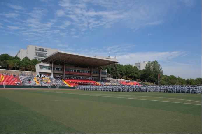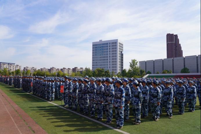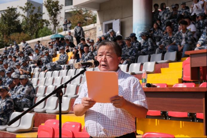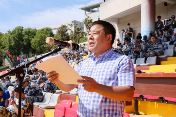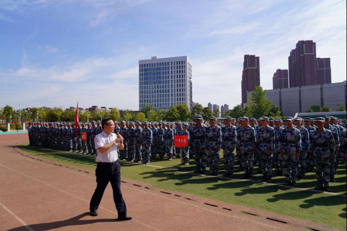 随着五星红旗冉冉升起,军训结训仪式暨总结表彰大会拉开帷幕。马蜂书记代表学校领导和全体教职工,对同学们的成长和成绩表示祝贺,并向承训教官表达由衷的敬意。他表示,军训磨炼意志,强健体魄,会为今后的学习生活打下良好的基础。在阅兵式上,同学们昂首阔步、雄姿英发、整齐划一,展现了军人的英姿和青春的风采。他希望同学们坚定信仰、自信阳光、脚踏实地、厚德尚能,主动融入大学生活,尽情展现风采,以实际行动献礼新中国成立70周年华诞,助力第七届世界军人运动会。