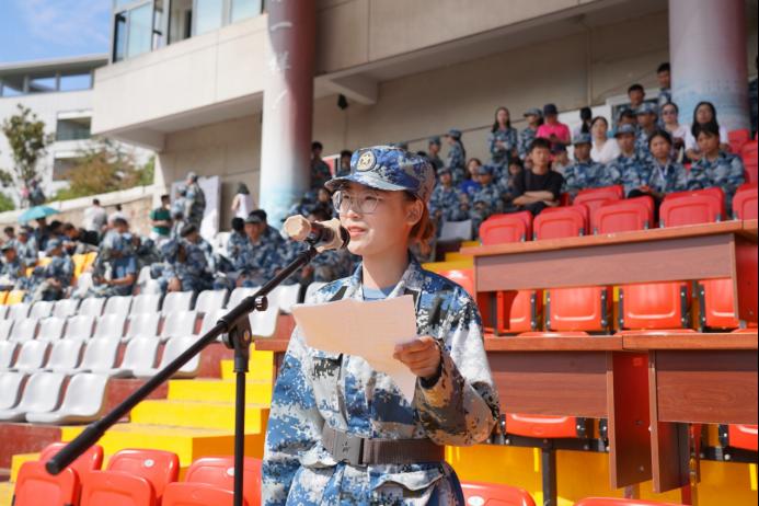 随后,学工处处长张水新宣读《关于2019级新生军训先进集体和先进个人的表彰通报》。15个连队被评为“优秀连队”,9名辅导员老师被评为“优秀指导员”,294名受训学生被评为“军训标兵”,299名受训学生被评为“军训优秀学员”。商学院2019级王欢同学代表全体参训学员表示,通过15天的军训,收获了心灵上的成长、体能上的提高、珍贵的情义,将继续坚持和发扬优良传统,以昂扬的姿态投入到学习和生活中,努力做到今天我以武软为荣,明天武软以我为荣。