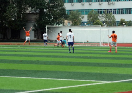 上半场开始第11分钟,我队在对方禁区内做出精妙传切配合,由8号球员余博文攻入一球,形势喜人。接近尾声,对方点球得分追平。下半场,暴雨来袭,场上攻守猛烈,我方门前险象环生,守门员吴思齐严防死守,奋力扑救,破解了对方多次进攻机会。
