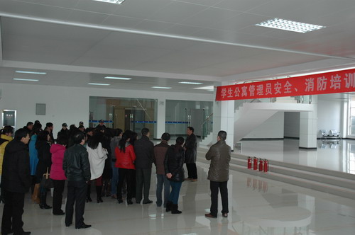 接着,由保安队长杨勇对学院学生公寓防火安全提出了具体要求。最后到学术报告厅后的空旷场地上演示了灭火器的使用,并组织参与培训的人员进行了演练。