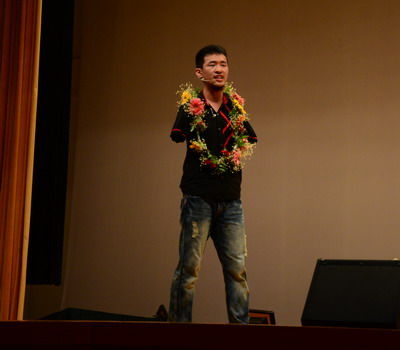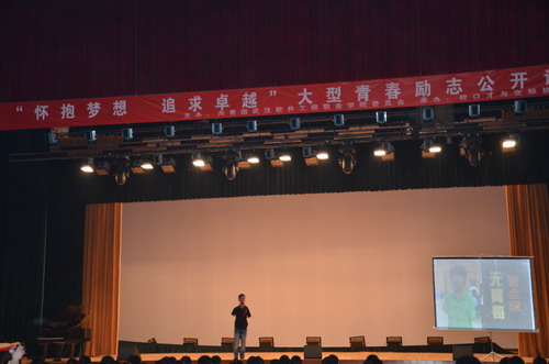 曹会琛是学院新一届的校园十佳青年,也是受广大网友热捧的“无臂哥”,因小时候碰到了变压器的避雷针而失去双臂,但他凭借着坚强的毅力,不仅学会了用脚写字,还学会了用脚吃饭、穿衣、洗衣、弹吉他等。不仅如此,他还学会了游泳,中学时被选入襄阳市游泳队,当年即拿下了湖北省运动会残疾人组50米自由泳金牌、100米仰泳银牌。在央视的《向幸福出发》和《道德观察》节目里,他向全国观众展现了他夺目的光彩。2011年9月,曹会琛带着对大学的憧憬来到了武汉软件工程职业学院,成为计算机与软件学院的一名大学生。在本次公开课上,曹会琛饱含深情和在场的同学们分享了他的成长故事和校园生活,并呼吁所有的学生都要珍惜生命和大学生活,保护好自己的梦想,感恩父母。他充满期许地说道:我有一个梦想,就是成为激励大师!因为在这个世界上没有任何一个事情是可以比帮助别人更快乐的了! 残缺并不可怕,心灵的残缺才是最可怕的,只要有梦想,翅膀折了心在飞翔,因为有你们的支持,我坚信我的梦想会越飞越高!”